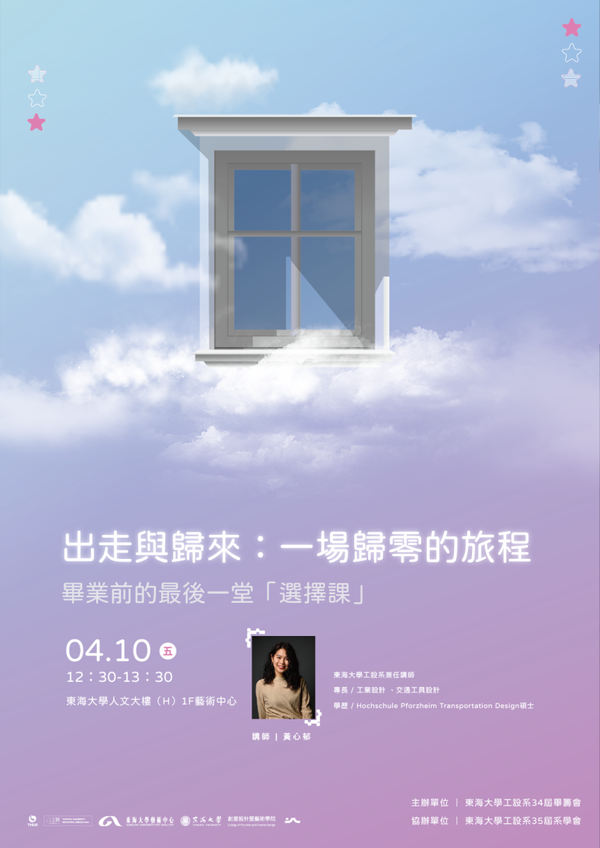 講座主題: 出走與歸來:一場歸零的旅程 畢業前的最後一堂課「選擇課」 講者:黃心郁 老師 時間:2026年04月10日(五)12:30~13:30 地點:東海大學人文大樓(H)1F藝術中心